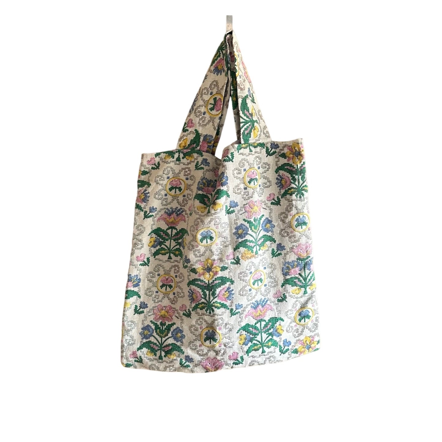 Upcycled tote bag, a unique piece handcrafted with care from vintage bark cloth fabric and lined with polycotton. Embrace the charm of sustainability as this tote showcases the beauty of repurposed materials.